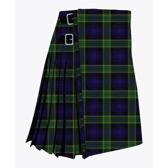 Each tartan kilt has 3 buckles and straps for size adjustment: genuine leather waist straps (4" long by 1 1/4" wide). Kilt straps on this kilt are set with an allowance of 2" looser. This kilt's front edge has fringe and is pleated to the sett but can be pleated to stripe by request. There are two belt loops at the back. The kilt has a 100% cotton lining for a soft feel when being worn. The standard kilt comes with a 5-yard, but you can convert it into an 8-yard by selecting the "8-yard kilt" option.