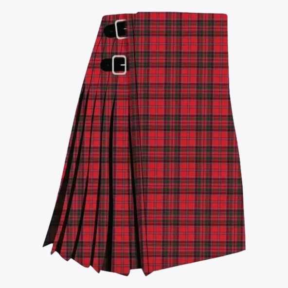 Each tartan kilt has 3 buckles and straps for size adjustment: genuine leather waist straps (4" long by 1 1/4" wide). Kilt straps on this kilt are set with an allowance of 2" looser. This kilt's front edge has fringe and is pleated to the sett but can be pleated to stripe by request. There are two belt loops at the back. The kilt has a 100% cotton lining for a soft feel when being worn. The standard kilt comes with a 5-yard, but you can convert it into an 8-yard by selecting the "8-yard kilt" option.
