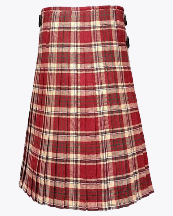 Each tartan kilt has 3 buckles and straps for size adjustment: genuine leather waist straps (4" long by 1 1/4" wide). Kilt straps on this kilt are set with an allowance of 2" looser. This kilt's front edge has fringe and is pleated to the sett but can be pleated to stripe by request. There are two belt loops at the back. The kilt has a 100% cotton lining for a soft feel when being worn. The standard kilt comes with a 5-yard, but you can convert it into an 8-yard by selecting the "8-yard kilt" option.