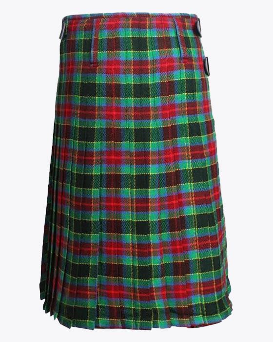 Each tartan kilt has 3 buckles and straps for size adjustment: genuine leather waist straps (4" long by 1 1/4" wide). Kilt straps on this kilt are set with an allowance of 2" looser. This kilt's front edge has fringe and is pleated to the sett but can be pleated to stripe by request. There are two belt loops at the back. The kilt has a 100% cotton lining for a soft feel when being worn. The standard kilt comes with a 5-yard, but you can convert it into an 8-yard by selecting the "8-yard kilt" option.