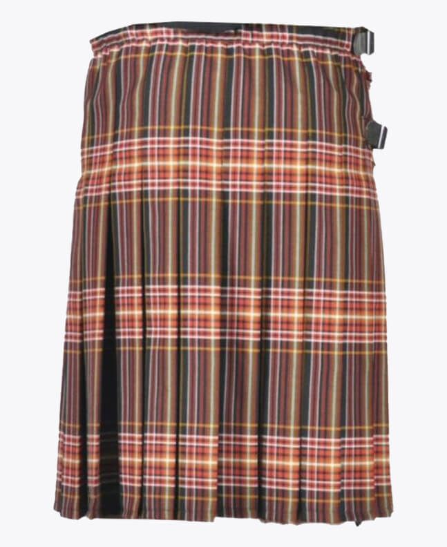 Each tartan kilt has 3 buckles and straps for size adjustment: genuine leather waist straps (4" long by 1 1/4" wide). Kilt straps on this kilt are set with an allowance of 2" looser. This kilt's front edge has fringe and is pleated to the sett but can be pleated to stripe by request. There are two belt loops at the back. The kilt has a 100% cotton lining for a soft feel when being worn. The standard kilt comes with a 5-yard, but you can convert it into an 8-yard by selecting the "8-yard kilt" option.