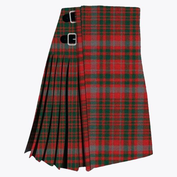Each tartan kilt has 3 buckles and straps for size adjustment: genuine leather waist straps (4" long by 1 1/4" wide). Kilt straps on this kilt are set with an allowance of 2" looser. This kilt's front edge has fringe and is pleated to the sett but can be pleated to stripe by request. There are two belt loops at the back. The kilt has a 100% cotton lining for a soft feel when being worn. The standard kilt comes with a 5-yard, but you can convert it into an 8-yard by selecting the "8-yard kilt" option.