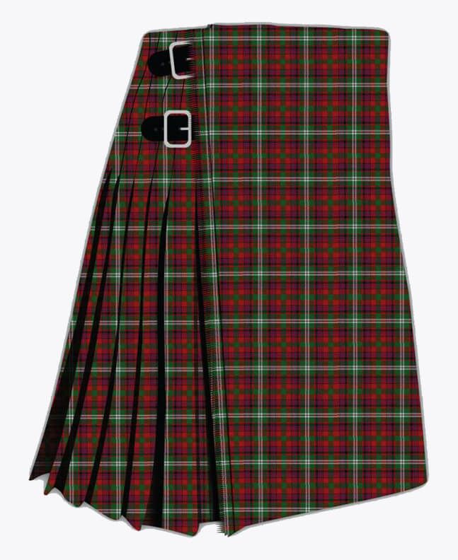 Each tartan kilt has 3 buckles and straps for size adjustment: genuine leather waist straps (4" long by 1 1/4" wide). Kilt straps on this kilt are set with an allowance of 2" looser. This kilt's front edge has fringe and is pleated to the sett but can be pleated to stripe by request. There are two belt loops at the back. The kilt has a 100% cotton lining for a soft feel when being worn. The standard kilt comes with a 5-yard, but you can convert it into an 8-yard by selecting the "8-yard kilt" option.