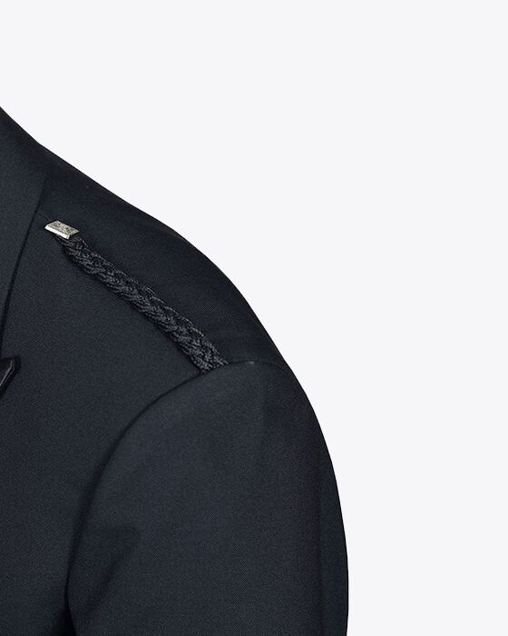 The jacket is made from premium-quality blue barathea wool and features braided epaulettes, satin lapels and square silver jacket buttons.
